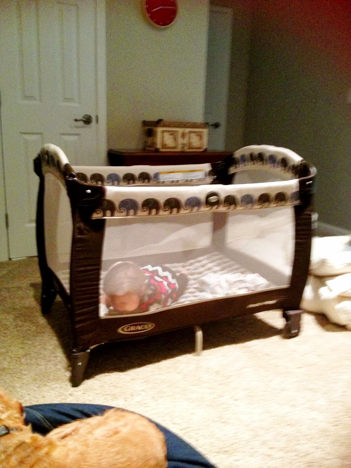 2. This girl is so mobile. Proficient army crawler and every once and a while gets all the way on her hands and knees. She is going to be crawling before I know... then walking... que tears, I am not ready for all of this! Anyways, I have broken back out the pack and play to keep her contained from time to time. She is not understanding why she can't crawl through the mesh...